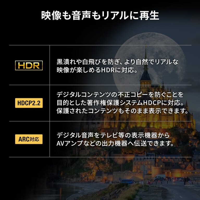 HDRやARC、HECなどの規格に対応しており、映像だけでなく音声も高品質で伝送可能だ。高輝度でコントラストのある映像を再生し、映画やプレゼンテーションなどもより迫力ある演出が可能になる。