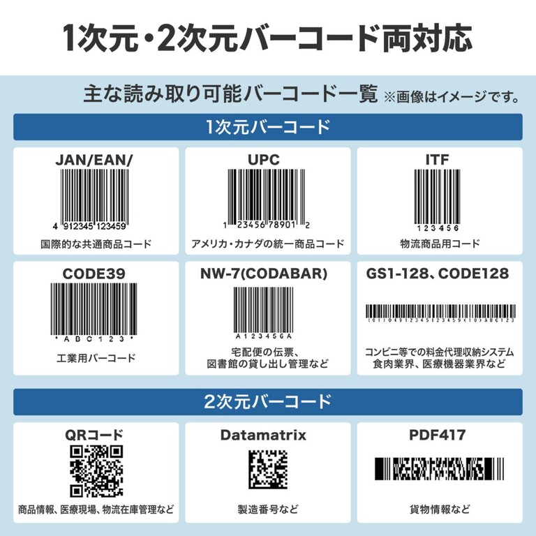 1次元コード(JAN・EAN・UPC・CODE39・GS1など)、2次元コード(QRコード・Data Matrixなど)の読み取りが可能だ。30フレーム/秒のスキャンスピードでスムーズに読み取る。