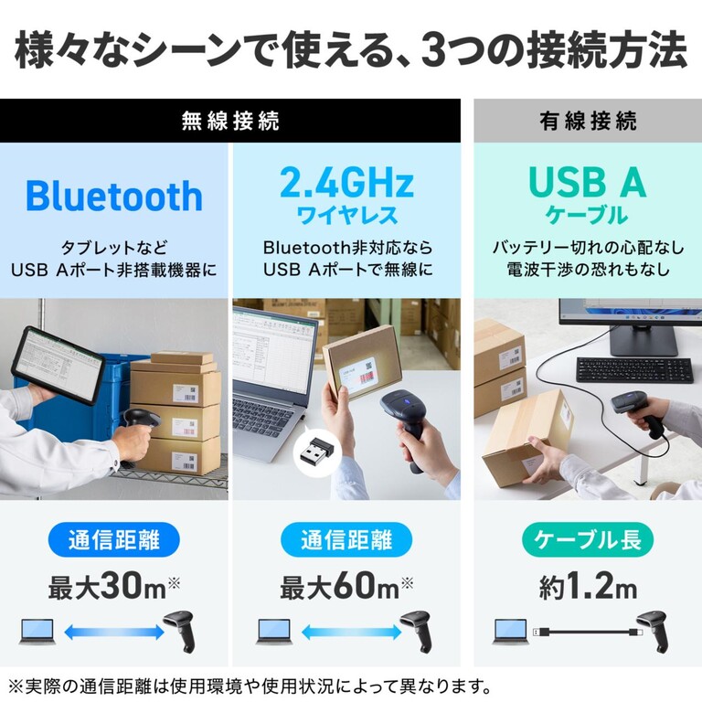 パソコンなどの接続機器と読み取るバーコードの距離が遠く、通信が安定しない場合に便利だ。