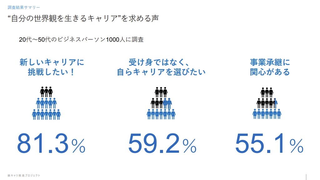 同社が行った20~50代のビジネスパーソンを対象としたアンケートでは、「新しいキャリアに挑戦したい」と選択した人が80%、「受け身ではなく、自らキャリアを選びたい」が60%、「事業承継に関心がある」が55%という結果になり、“自分の世界を生きるキャリア”を求める声が多いことがわかる。この結果を受けて、高橋氏は「我々はこの継業ということを、1つのキャリアの選択肢として、皆様にご提案していきたいと思っています。就職、転職、起業に継ぐ第4のキャリアとしての継業です」と述べた。