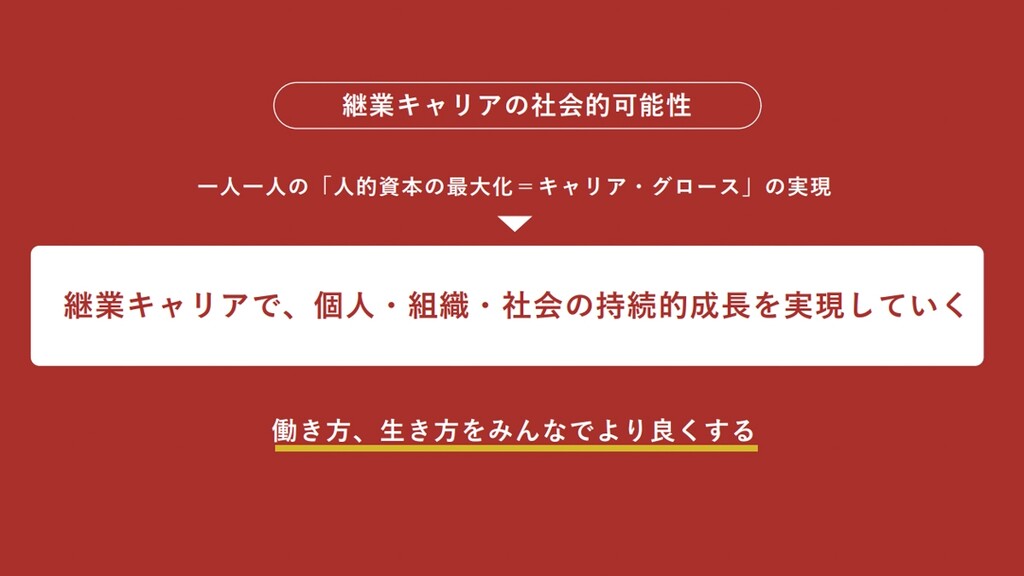 ただ、日本型企業をやめてフルコミットするという意思決定ができる人もいるかもしれないが、それは難しい判断になるため、どちらかというとリスキリングの延長であり兼業型、副業型ということをイメージしつつ、みんなでより良い「継キャリ」を作ることを目指すと話した。
