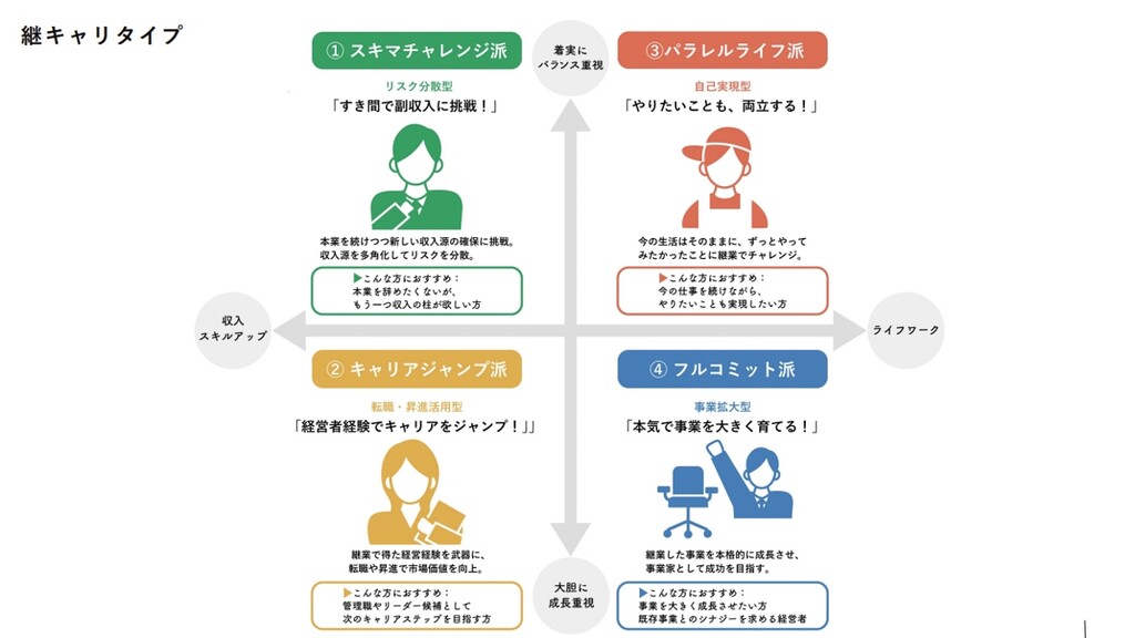 さらに、キャリア形成の4つのタイプも提唱し、「キャリアジャンプ型(転職・起業など)」「フルコミット型(完全専念)」「パラレル型(複数仕事を並行)」「スキマチャレンジ型(小さな副業・実験的活動)」の4つに分類を示した。