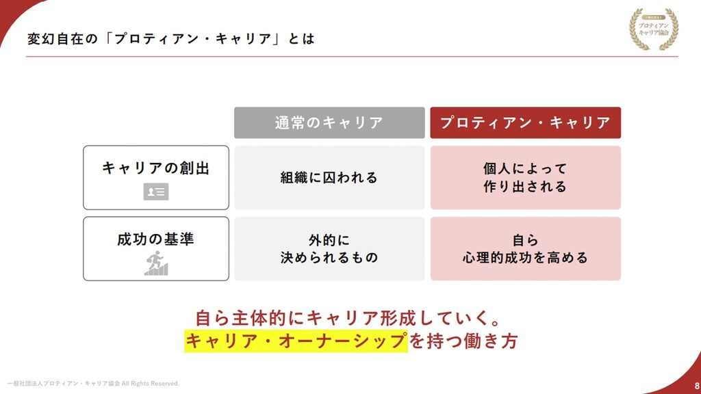 プロティアン・キャリアは、個人が主体的に自分の価値観に基づき、柔軟にキャリアをデザイン・変化させていくキャリア形成の考え方を指す。