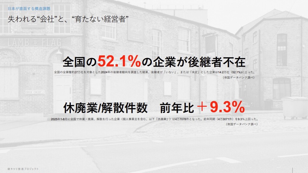 中小企業では、深刻な後継者不足が社会問題として注目されている。国内には約27万社の中小企業があるが、そのうち52.1%が後継者不在であり、後継者難を理由とした倒産は2年連続で500件を超えている。技術、雇用、地域ブランドといった貴重な資源が、「継ぐ人がいない」という理由だけで失われつつある。