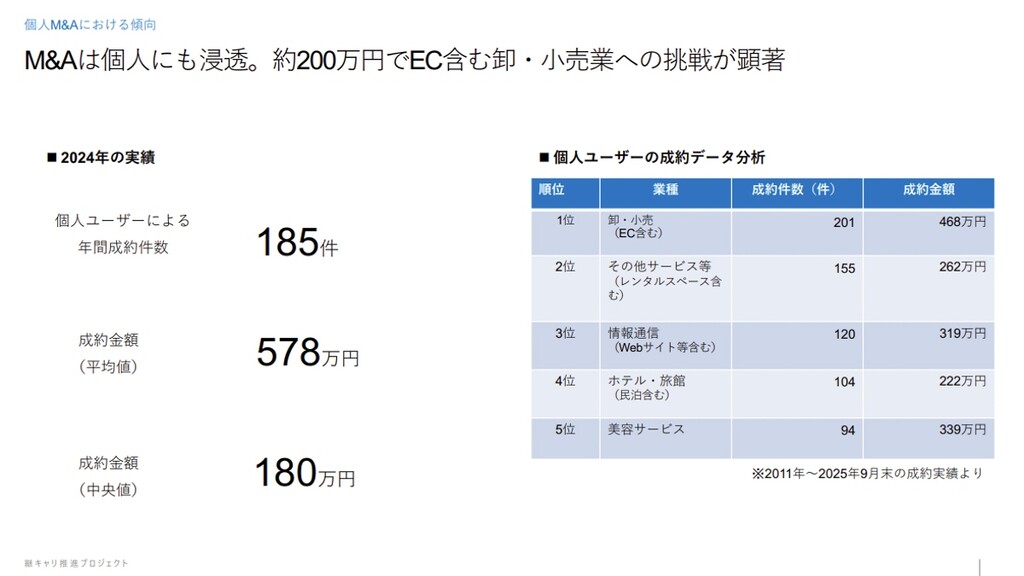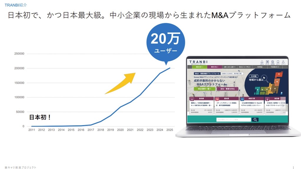 現在、トランビは登録ユーザー数20万人を超え、累計掲載案件数は22,000件、成約件数は約2,000件に達している。そのうち約8割は「初めて経営に挑戦する人」であり、副業から経営へと踏み出すケースが多いことが特徴だ。また、平均取引額は約600万円、中央値は約180万円と、個人でも手が届く水準である点も強調された。