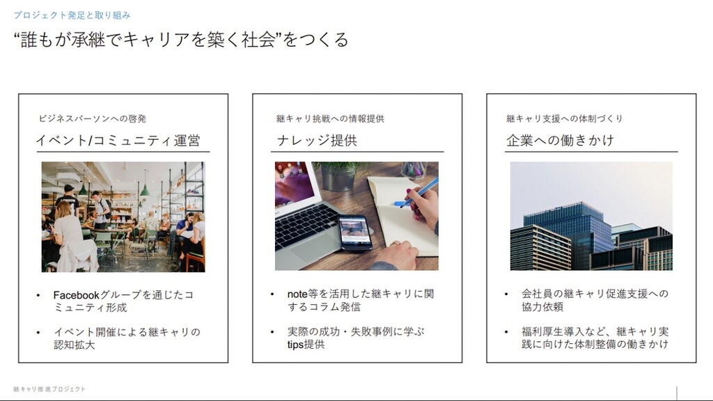 noteなどを活用した継キャリに関するコラム発信、実際の成功・失敗事例に学ぶtipsなどナレッジシェアを行い、継キャリへのチャレンジを支援する。