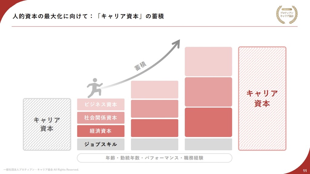 また、キャリアを「資本」として可視化できると主張し、キャリアは感覚的なものではなく、資産(資本)として管理・評価すべきであると強調した。その具体的な手法として、「キャリアBS(バランスシート)」の考え方を導入している。