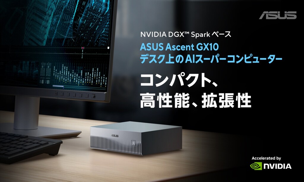 ASUS JAPAN株式会社は、新型パーソナルAIスーパーコンピューター「Ascent GX10」を発表し、2025年10月15日より法人向けに販売開始しました。本製品は、AI開発者、研究者、データサイエンティストに向けて設計されたコンパクトかつ高性能なデスクトップAIスーパーコンピューターであり、NVIDIA GB10 Grace Blackwell SuperchipおよびNVIDIA AIソフトウェアスタックを搭載。小型筐体ながら、フルスタックのAIパフォーマンスを実現します。