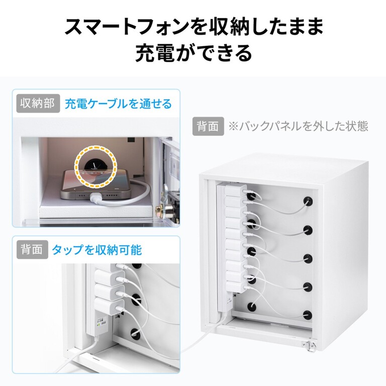 本体の背面に電源タップの収納スペースが設けられているため、ケーブルやアダプタが外から見えない。各収納部には充電ケーブルを通す専用のケーブル口があり、スマートフォンを収納したまま充電できる。※充電用のACアダプタ、ケーブル、タップは付属していない。