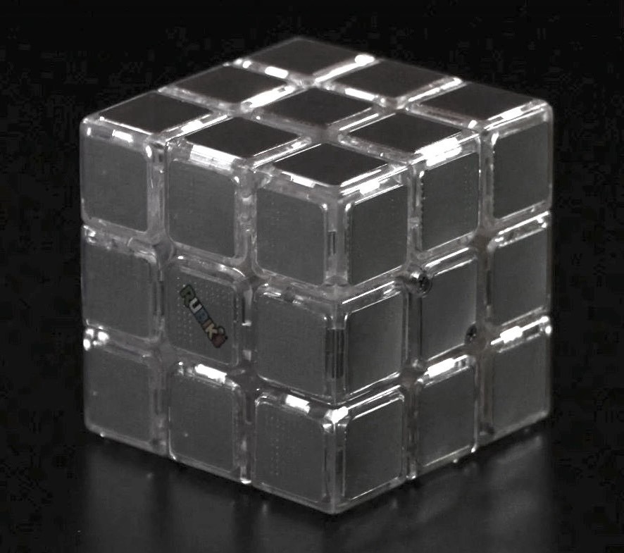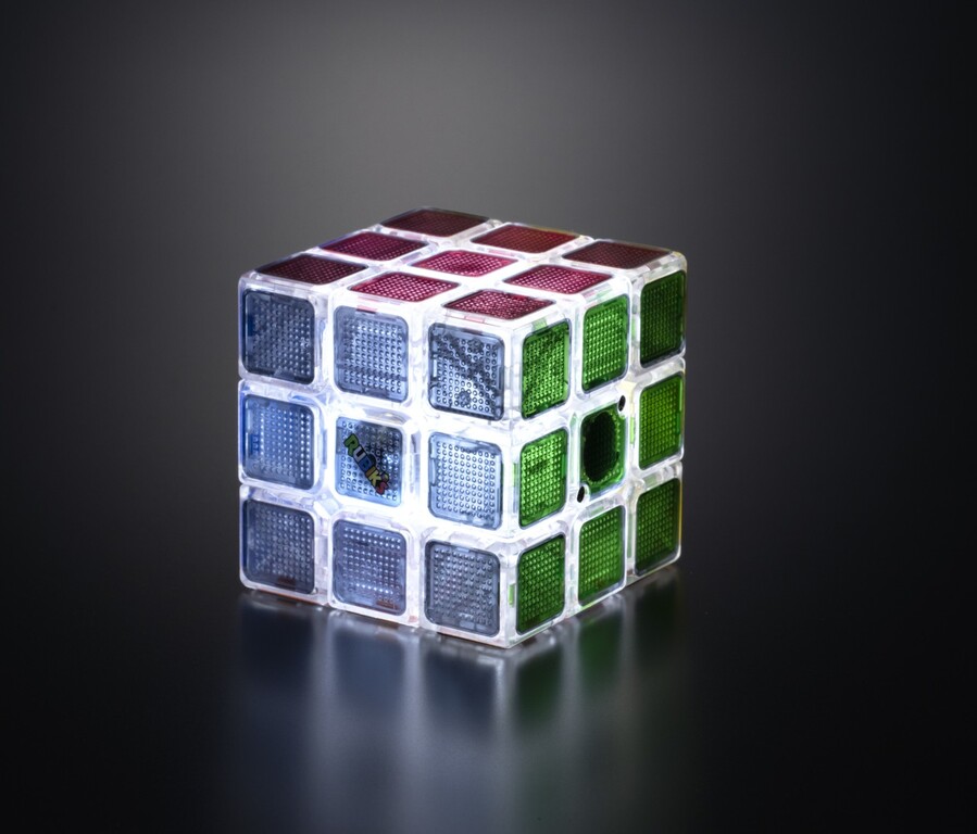 通常時は全面が鏡面仕上げ。中央のルービックロゴのあるパネルを押すと発光し、隠れていた色が浮かび上がる。