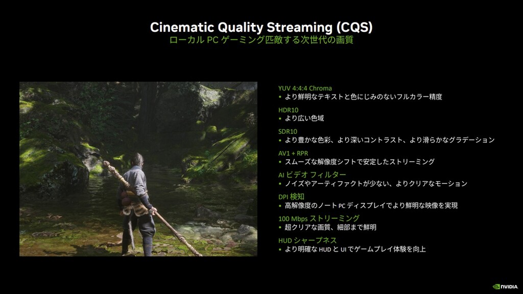クラウドゲーミングの課題とされてきた「映像圧縮による色のにじみや暗部の情報欠落」も改善された。新機能「Cinematic Quality Streaming(CQS)」により、従来のYUV 4:2:0では表現が難しかった映像を、YUV 4:4:4のフルカラー転送で配信可能となっている。