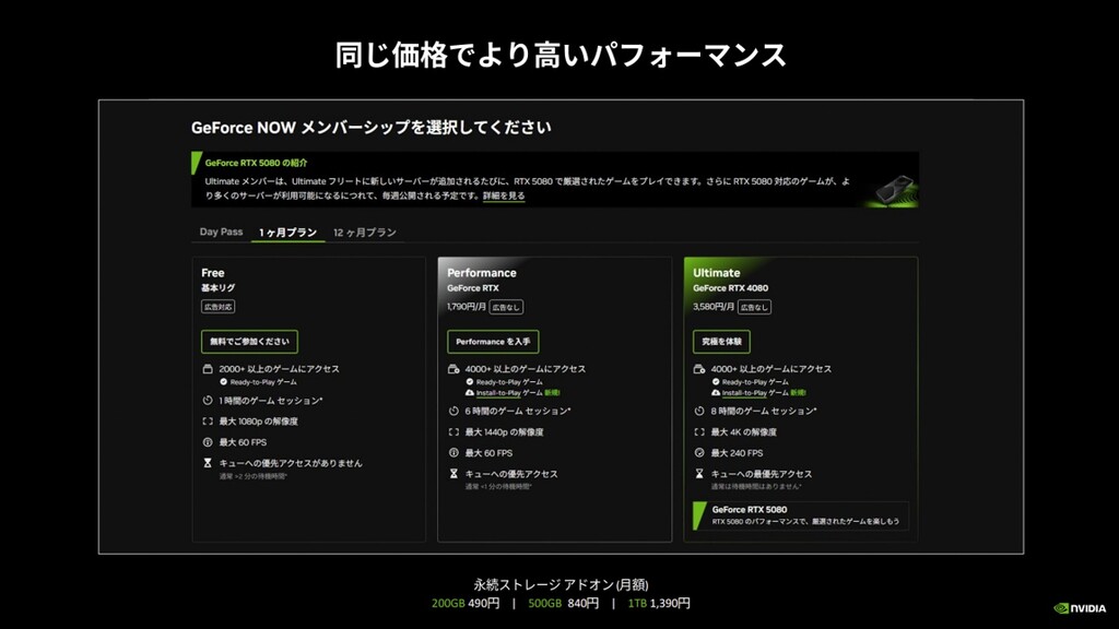 これにより、対応タイトルは従来の約2,000本に加え、さらに2,200本以上が追加される見込みである。有料プランのユーザーには100GBのクラウドストレージが割り当てられ、さらに有料アドオンの「永続ストレージ」によってゲームデータを保持することも可能となっている。