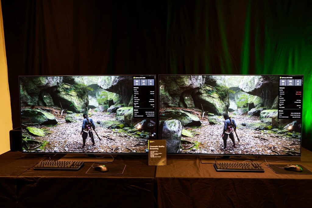 デモ体験会では、『黒神話:悟空』のCQSオン/オフを比較できる環境が用意され、モニターを横並びにして実際にプレイすることができた。「映像圧縮による色のにじみや暗部の情報欠落」が改善されたという説明の通り、CQSをオンにすると、特に画面の黒い部分に深みが増し、より自然な映像表現が確認できた。