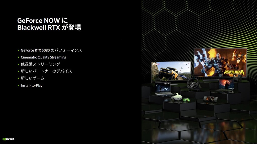NVIDIAは、2025年10月22日(水)に「GeForce NOW Blackwell RTX メディア向け説明会&デモ体験会」を開催した。説明会では、クラウドゲーミングサービス「GeForce NOW」の大規模アップデート「Blackwell RTX」の詳細が紹介された。今回のアップデートでは、新GPU「GeForce RTX 5080」を搭載した最新サーバー「RTX 5080 SuperPod」への刷新に加え、新映像技術「Cinematic Quality Streaming(CQS)」や対応デバイスの拡大、新機能「Install-to-Play」など、多岐にわたる進化が盛り込まれている。すでに日本国内でも提供が開始されており、Ultimate会員であれば新機能を利用可能だ。