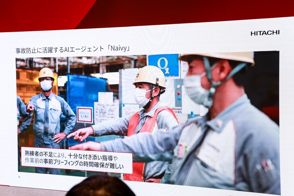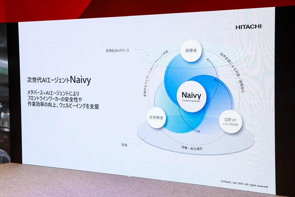 日立ブースは比較的大規模なブースになっていたが、ブース内に入りきらないほどの人が集まり、同社への関心の高さが表れていた。中でも注目を集めていたのは、日立の次世代AIエージェント「Naivy(ナイビー)」のプレゼンだ。Naivyは、メタバース上で現場を導く次世代AIエージェントであり、経験の浅い現場作業者の判断や安全な業務の遂行を支援する。