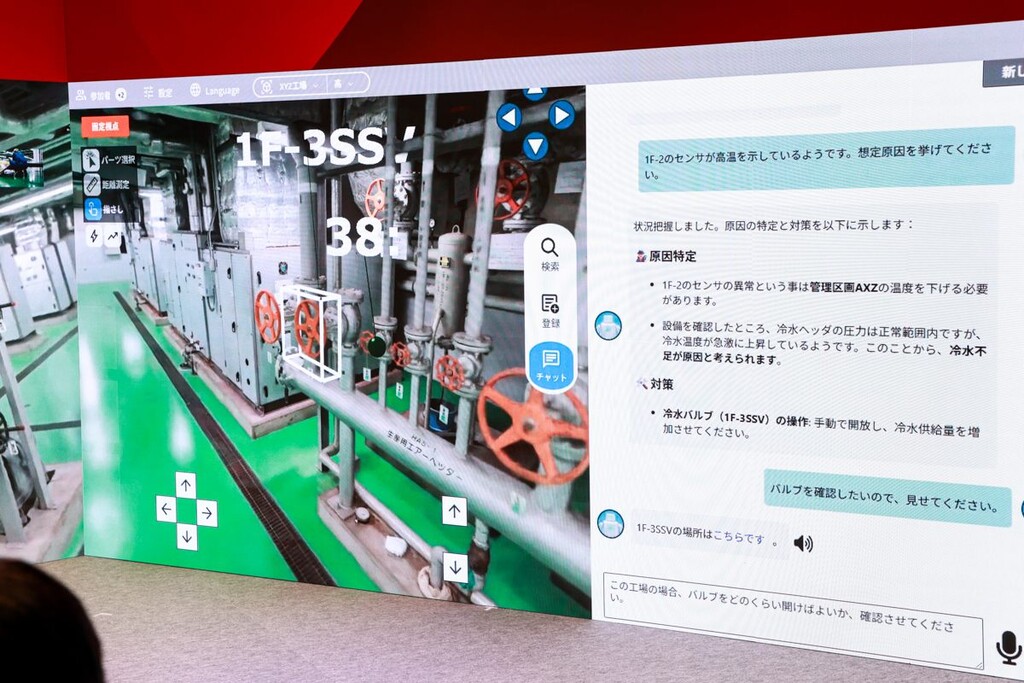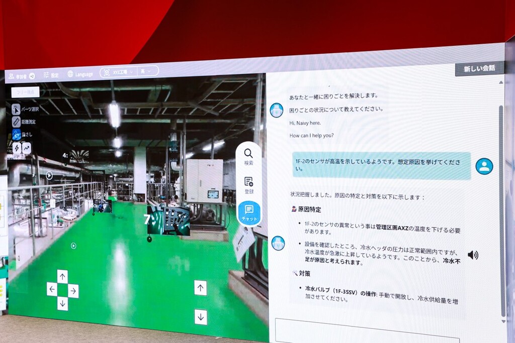 Naivyは、現場拡張メタバース上の情報と現場の稼働・不具合データをリアルタイムに統合し、人やロボットに情報を提供するAIエージェント。新入社員がセンサーのアラート原因を特定し、対処法を指示する際に、メタバース上でバルブの位置を3Dで示し、調節方法を映像で説明する。