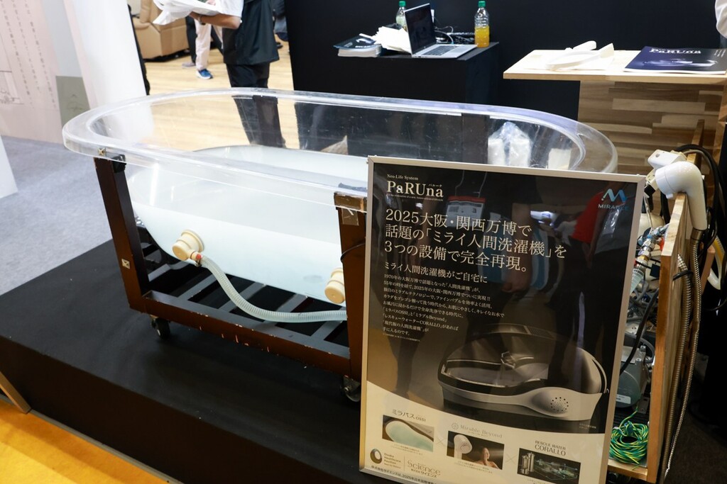 ヤマダホームズのブース内にて、株式会社サイエンスは、今年の「大阪・関西万博」で話題になった「ミライ人間洗濯機」を3つの設備で完全再現していた。