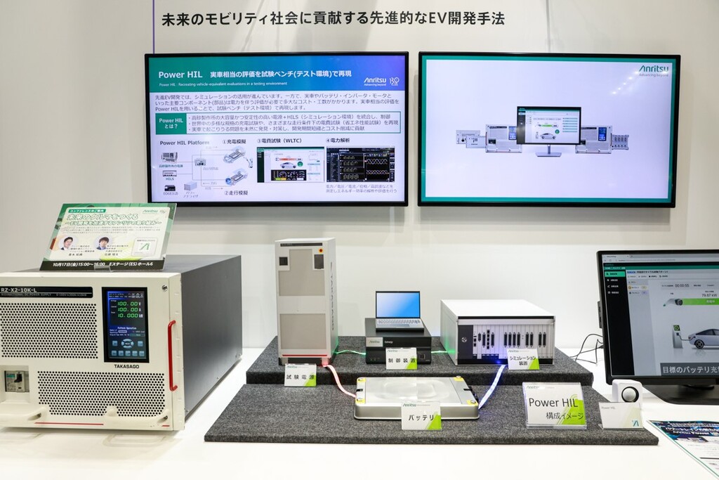 会場には、「Power HIL構成イメージ」として、バッテリー、シミュレーション装置、制御装置、試験電源が接続されたものが展示されていた。