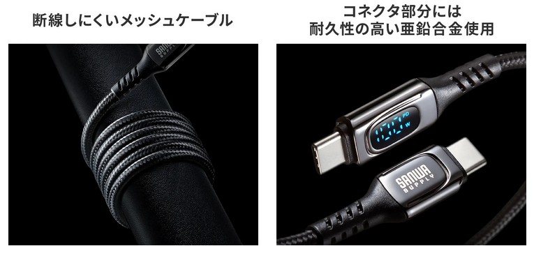 サンワサプライ株式会社が運営している直販サイト『サンワダイレクト』は、最大PD100W出力に対応し、電力自動分配&液晶表示で2台を同時に充電できる高耐久USB Type-Cケーブル「500-USB098BK」を発売した。