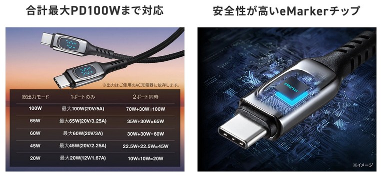 PD100W(20V/5A)までの高出力に対応し、ノートパソコンやタブレット、スマートフォンなど幅広い機器を急速充電が可能だ。高出力でも安全設計のeMarkerチップを内蔵し、安定した給電を実現する。
