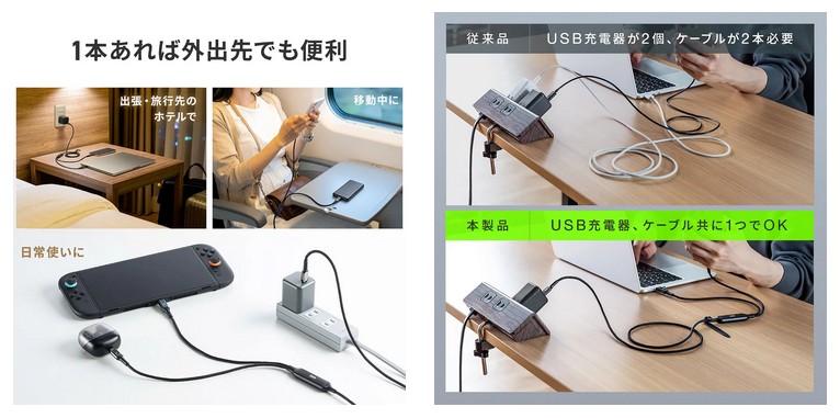 コンセントが少ないカフェや空港、出張先でも1本で2台を同時に充電。ケーブル1本で充電環境をシンプルにできるため、荷物を減らしたいビジネスユーザーやミニマリストにも最適だ。