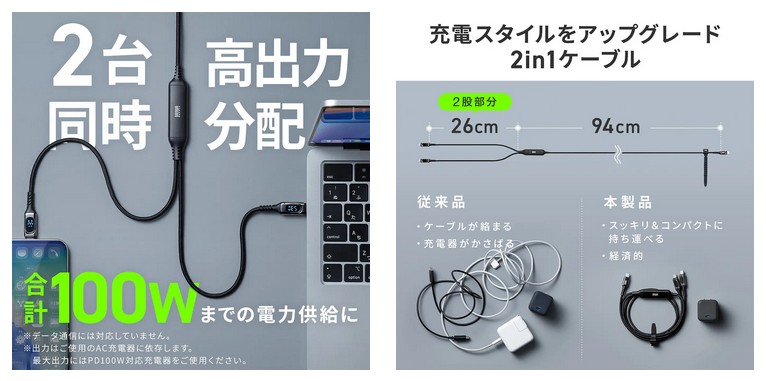 - 2台同時に充電できる!電力表示機能付きで100W対応の2in1 Type-Cケーブル はコメントを受け付けていません