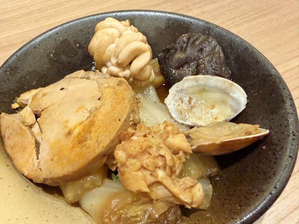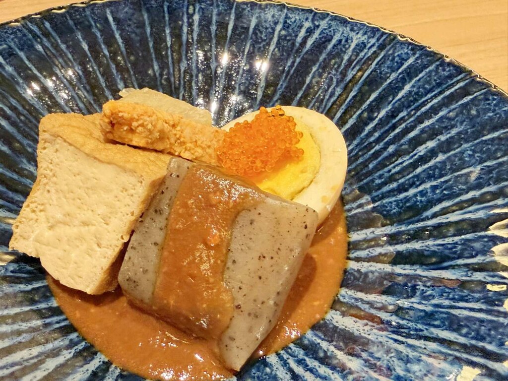 卵は濃厚な黄身と出汁の旨味が絡み合い、まるで海鮮茶碗蒸しを食べているような贅沢感。こんにゃくや練り物にも出汁の個性がしっかり移り、ひとつひとつが主役級の存在感を放っている。