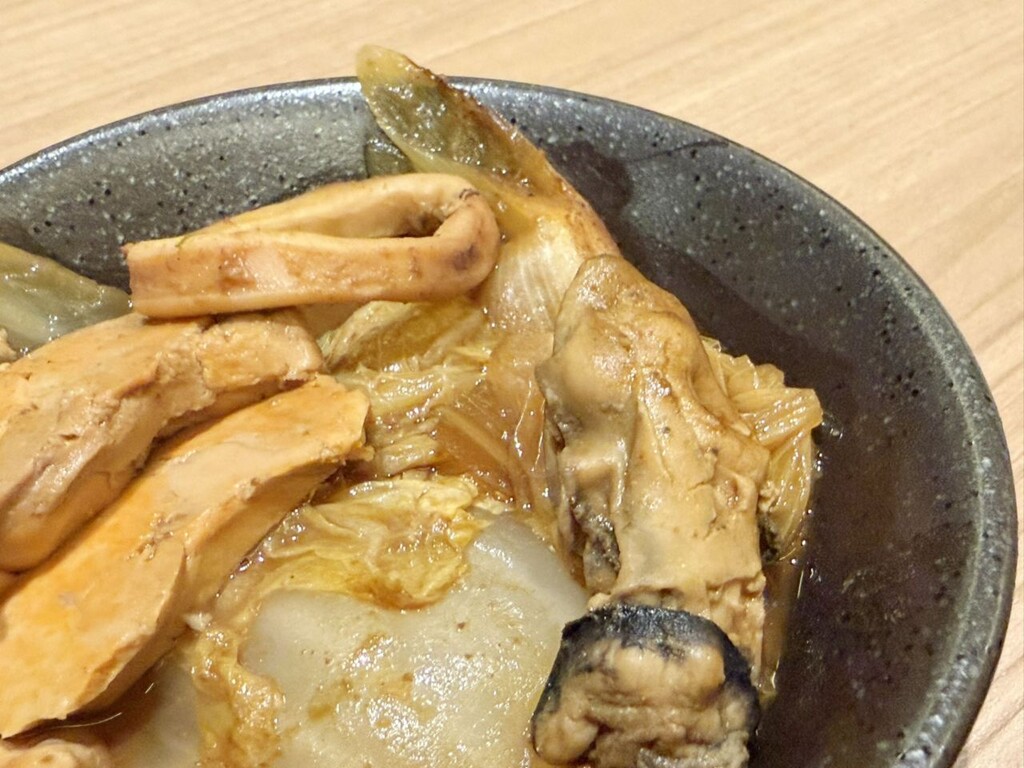 まず、だしの深みが尋常ではない。牡蠣や白子、あん肝といった“海の濃縮物”が生み出す旨味が幾重にも重なり、舌にのせた瞬間、旨味が波のように押し寄せる。塩味は控えめながら、魚介のコクとまろやかな脂の甘みが絶妙なバランスで調和している。