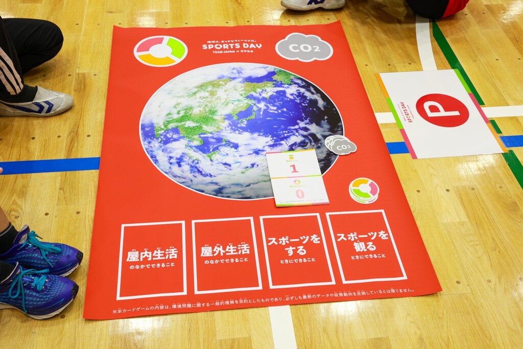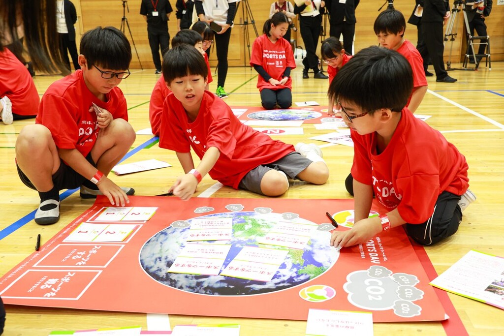 第二部の「サステナビリティワークショップ」では、橋本選手とともに子どもたちが環境問題について学ぶゲームが行われた。ゲームの前には、地球温暖化やCO₂など、サステナビリティに関する基礎的な解説が行われた。