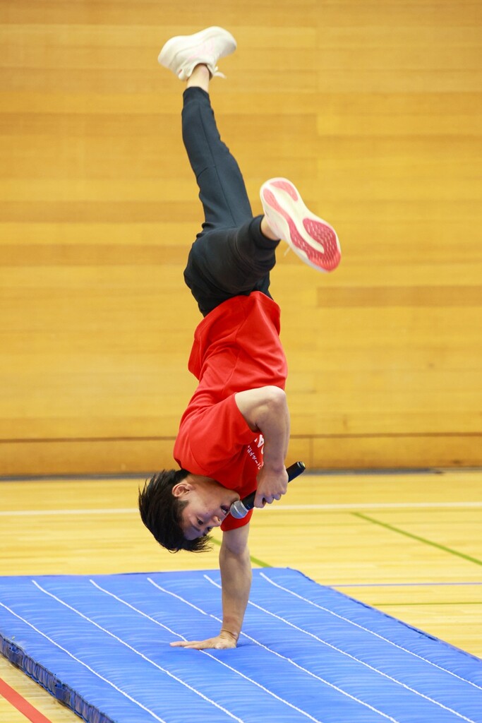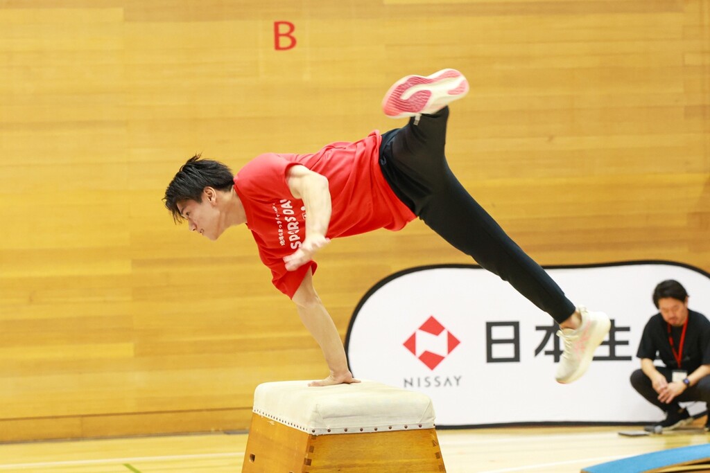 まず、跳び箱をあん馬のように使い、両腕だけで体を支えながら脚を大きく開いて連続回転を披露。続いてマットでは、ダイナミックな連続バク宙を決め、会場からは大きな拍手と歓声が湧き起こった。