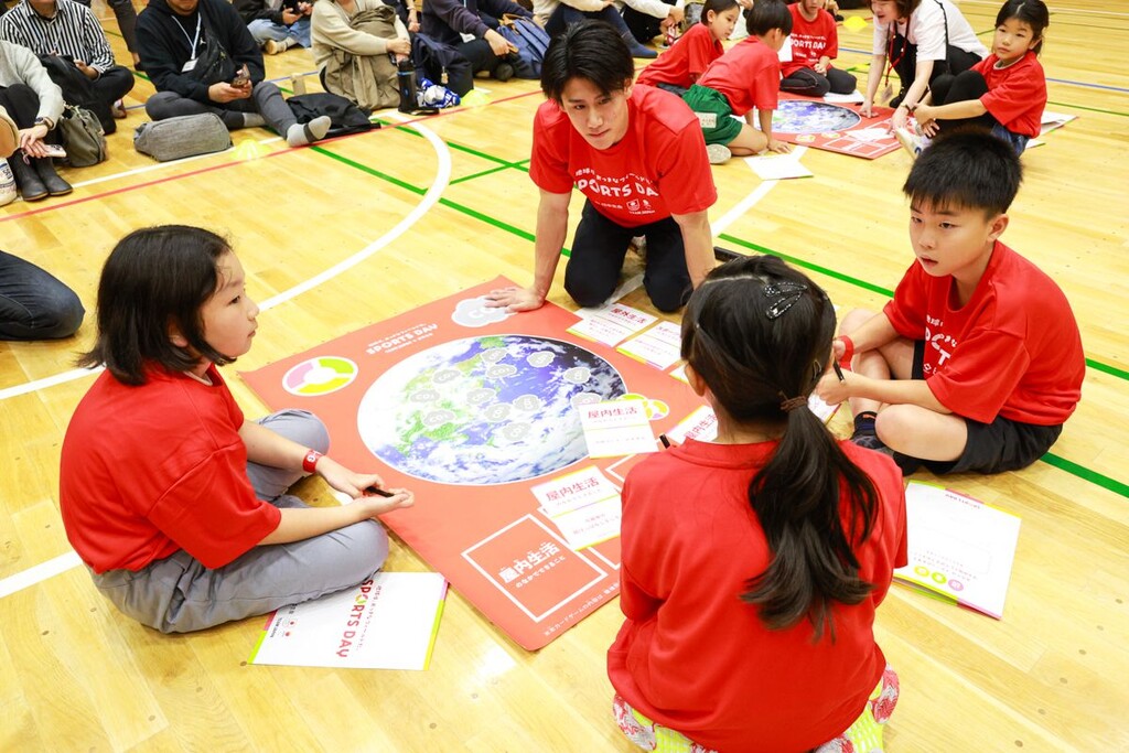 子どもたちは3〜4人のグループに分かれ、話し合いながらゲームを進めていった。橋本選手は人数の少ないグループに加わり、子どもたちと一緒に地球環境の保護について考えながら、ゲームとコミュニケーションを楽しんでいた。
