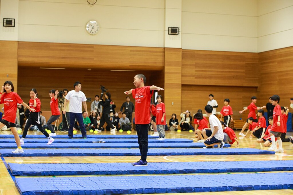 サステナビリティや子どもの成長に関して、大切なことを聞かれた橋本選手は「今日は文化の日ということで、私たちが今生きていることですごく身近に感じる問題だったり、社会の問題を知ることによって、この文化をもっと良くしていこう、次の世代につないでいこうという運動だったり、学習をしてもらいたいと思っています。今日は積極的に発言したり、運動したりということが、来年の文化の日にはちがったことができると思うので、今日は積極的にいきましょう。今日はマット運動をするので、決まったらカメラのみなさんに向かってガッツポーズしてみましょう」と、子どもたちに伝えた。