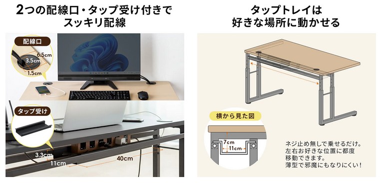天板には2つのケーブル配線口を装備。PCや周辺機器のコードをすっきり整理でき、壁際に設置しても邪魔になりません。さらにタップ受け付きで足元もすっきり。ホコリ防止にもなり、美しく清潔なデスクをキープできる。