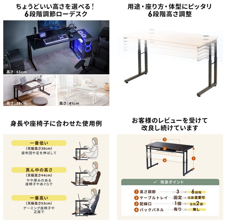 天板の高さは38〜53cmの間で6段階に調整可能。座布団や座椅子の厚み、体格に合わせて細かく設定でき、長時間の作業でも姿勢を保ちやすい設計だ。在宅ワークやオンライン学習など、ライフスタイルに合わせた快適なデスク環境を実現する。
