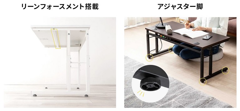 天板裏にはリンフォースメント(補強材)を搭載し、天板と脚部をしっかり固定。ぐらつきや歪みを防ぎ、安定感のある使用が可能だ。また、アジャスター付き脚部で床の傾きにも対応し、どんな場所でもしっかり安定する。