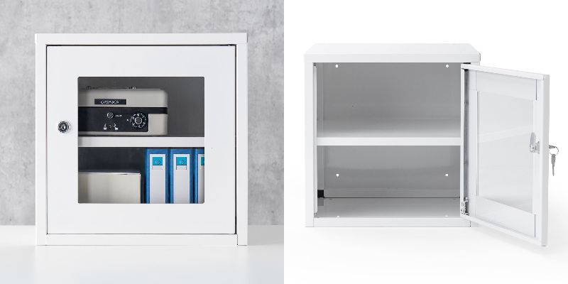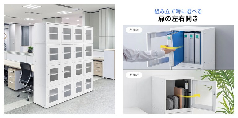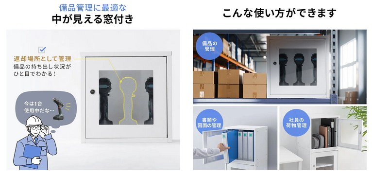 スチール製の扉に設けられた小窓から、扉を開けずに中の様子を確認できる。オフィスの書類管理や学校での備品保管など、日々の業務効率化に貢献する。