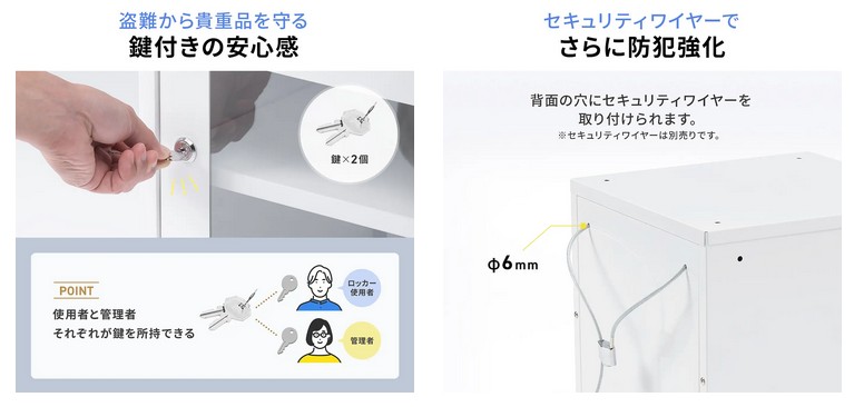 付属の鍵(2本)で施錠できるため、重要書類や電子機器の保管にも安心。さらに背面の穴にセキュリティーワイヤーを通せば、盗難防止にも対応可能だ。