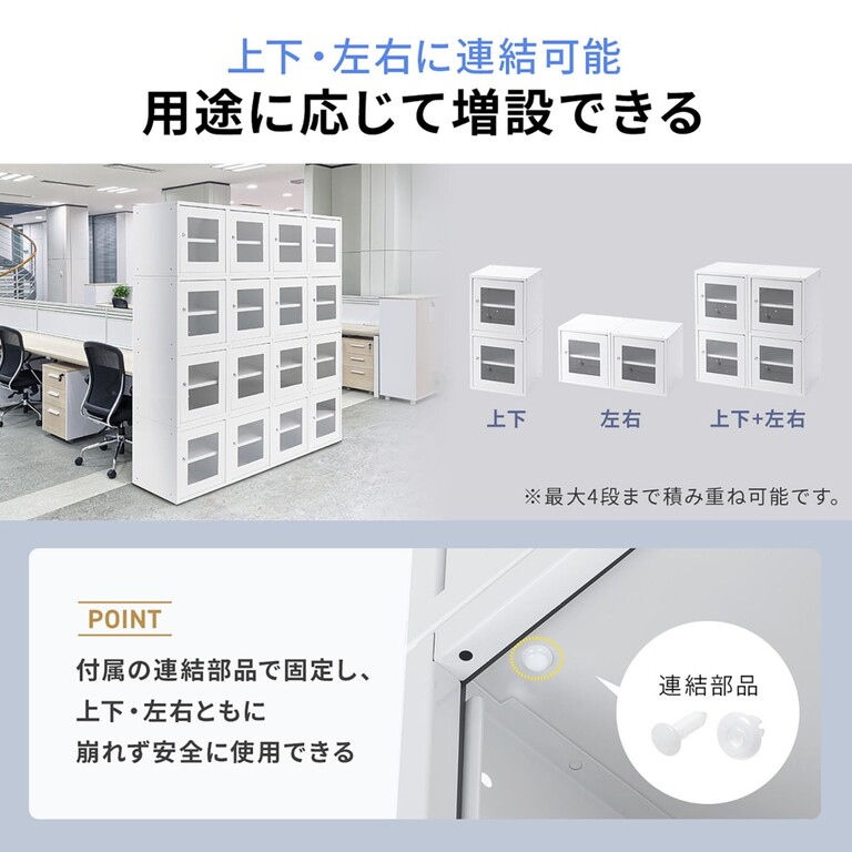 縦にも横にも連結できる構造で、収納場所に合わせた自由なレイアウトが可能だ。最大5段まで連結できる。