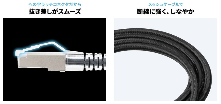 頻繁な抜き差しにも強い“への字ラッチコネクタ”と、断線に強いメッシュケーブルを採用。柔らかく取り回しやすいのに、高い耐久性を実現した。