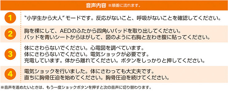 実際にAEDに使用されている音声を収録しており、緊迫感が伝わる。