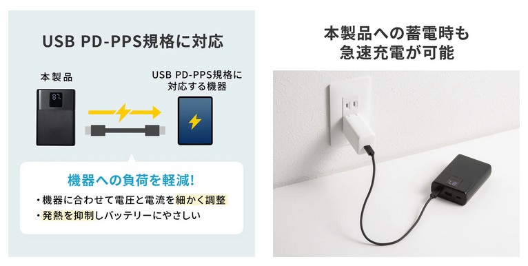 USB Power Delivery(USB PD)規格による最大20Wの出力に対応し、対応スマートフォンやタブレットなどへ急速充電ができる。急速充電時をお知らせする表示機能も備えている。