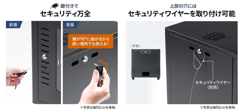 前扉と背面パネルには鍵を備え、不正開閉を防止する高いセキュリティー性を確保している。