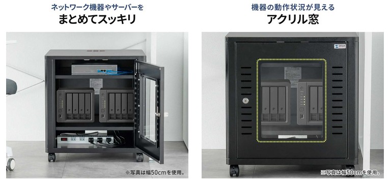 サンワサプライ株式会社が運営している直販サイト『サンワダイレクト』は、機器の動作状況が分かるアクリル窓付きで、鍵付き・ワイヤー取り付け可能でセキュリティも万全。脚を取り付けるだけの完成品での発送で、すぐ使える中型サイズの機器収納ボックス「100-SV037BK(幅60cm)」「100-SV038BK(幅50cm)」「100-SV039BK(幅40cm)」を発売した。