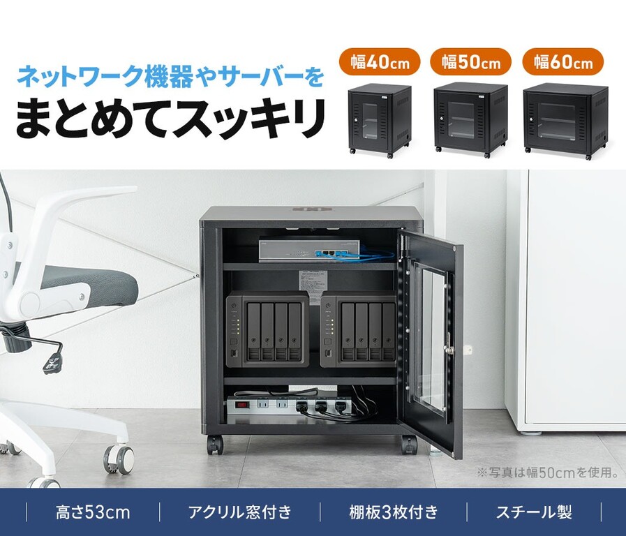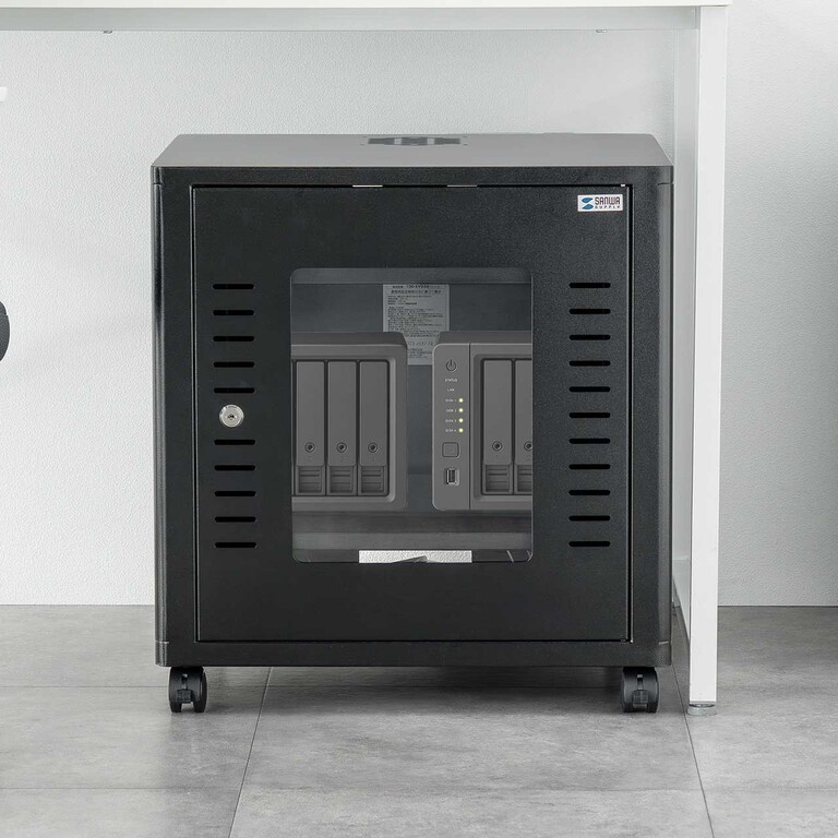 ネットワーク機器やNAS、録画機器などをまとめて収納できるスチール製の堅牢な機器収納ボックス。