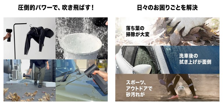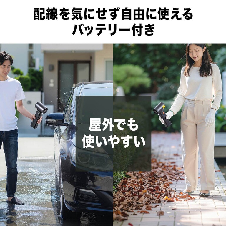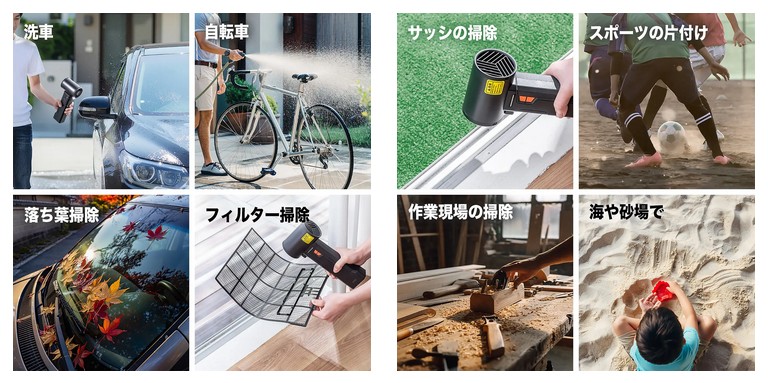 本製品は最大風速約55m/sという圧倒的な風力を実現し、車内の細かなホコリや機器の隙間に入り込んだ微粒子までしっかり吹き飛ばす。専用ノズルを使わずとも、約6cmもの広い射出口から大量の風を放出できるため、広範囲を一気に清掃可能。パソコン、家電、車内、ガレージなど、さまざまな場所で「一掃する爽快感」を体感できる。