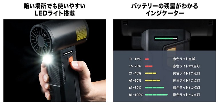 LEDライトを搭載しており、車内のすき間や家電の裏など暗い場所でも見逃しなく清掃できる。また、風量とバッテリー残量が一目で分かるインジケーターを備え、使用中の不安を解消。さらに、電源入れっぱなし防止の警告音や安全設計も採用されており、初心者でも安心して使用できる。