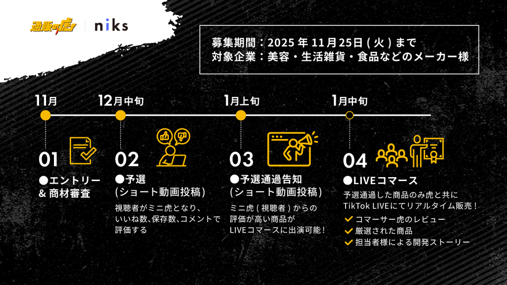 各種インフルエンス・プラットフォーム事業を展開する株式会社トリドリのグループ会社でアフィリエイト事業を担う株式会社niksは、株式会社通販の虎と合同で、視聴者参加型LIVEコマース企画『TikTok版通販の虎-年末年始SP企画-』を開催する。