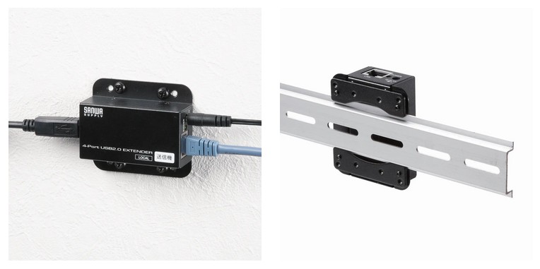 付属の部品で、壁やDINレールに取り付けできるので、多様な接続環境に対応している。