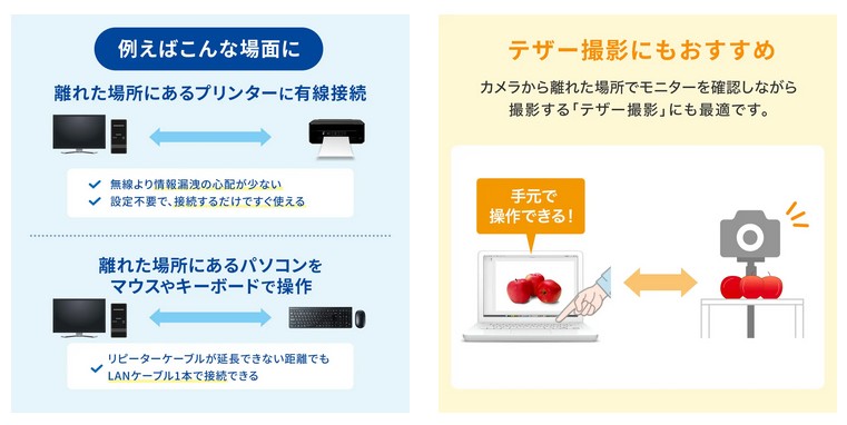 通常のUSBケーブルの延長では届かない場所にあるカメラ・プリンター・ハードディスクドライブ等と、パソコンを有線接続したい場合に便利だ。