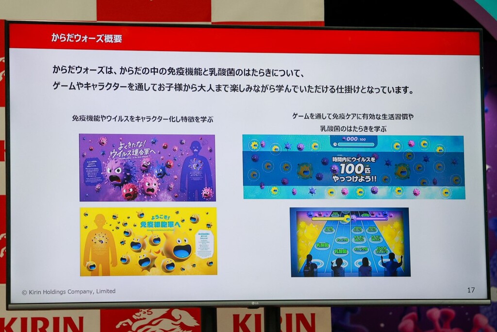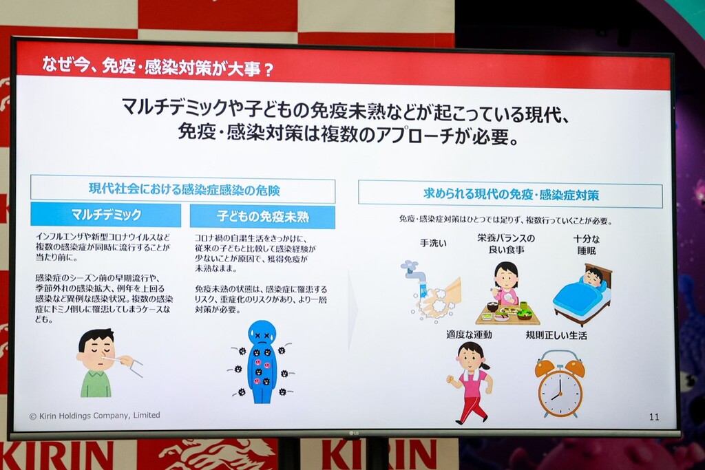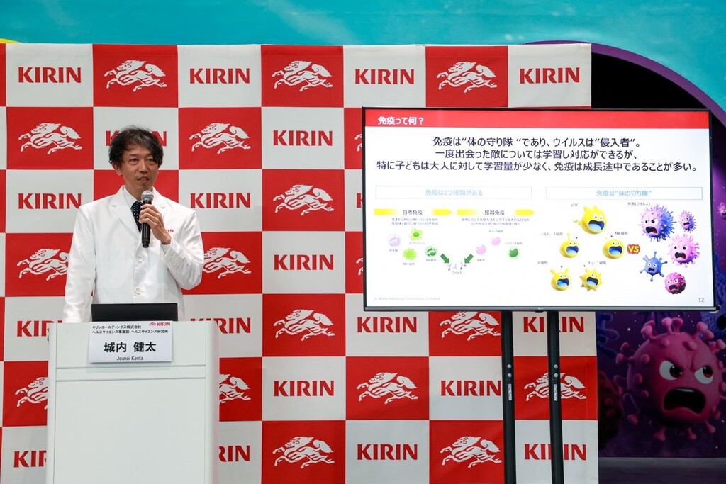 また、 免疫ケアの重要性として、健康の土台であること、本人が自覚しにくい機能であること、家族間での感染リスクが高いことが挙げられた。「体のウォーズ」は、子どもたちが楽しみながら免疫を学べるよう、テーマパークのようなビジュアルや体験型のゲームが用意されていることを紹介。キリンが40年にわたる免疫研究の知見を基に、親子で楽しく学べる大規模なイベントを日本科学未来館で開催することの意義が述べられた。